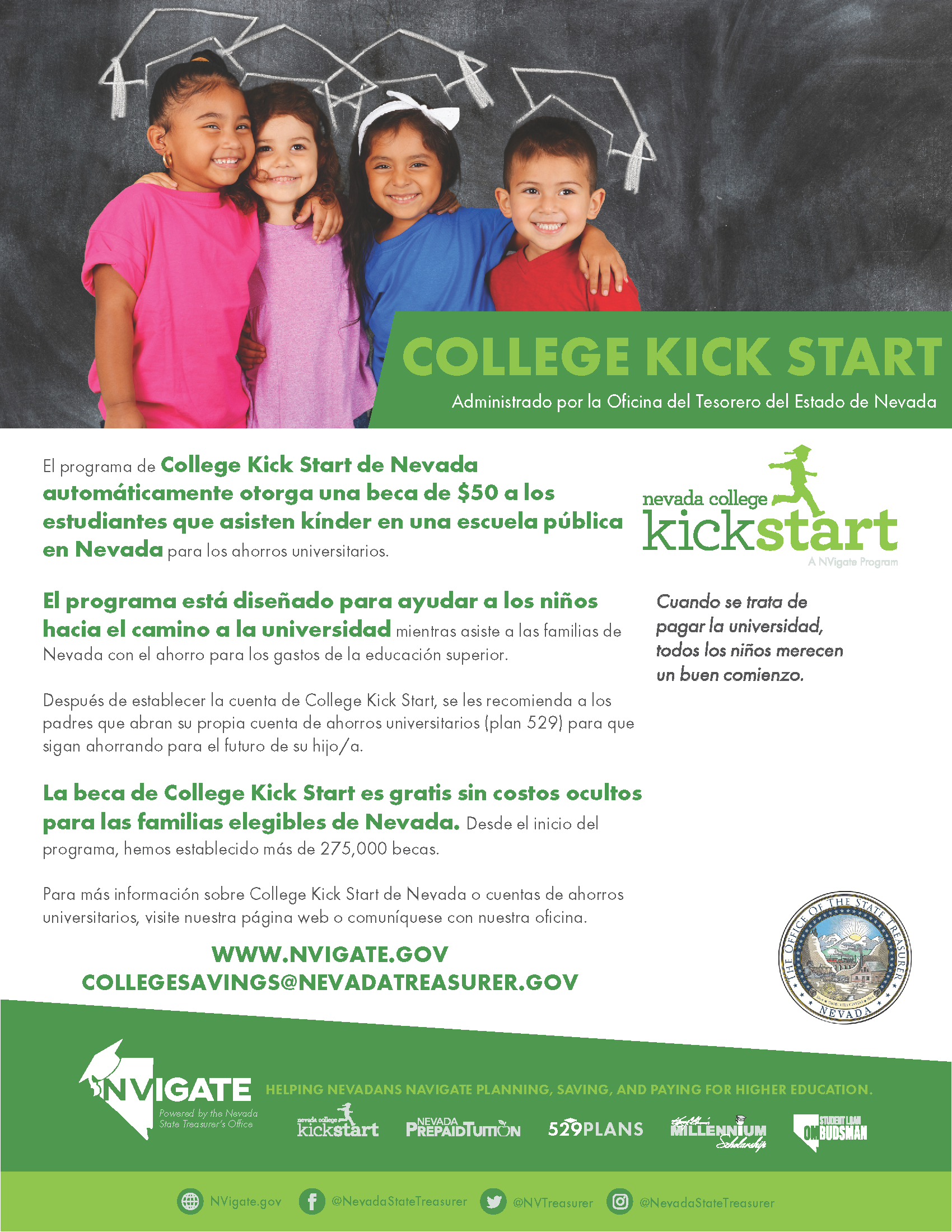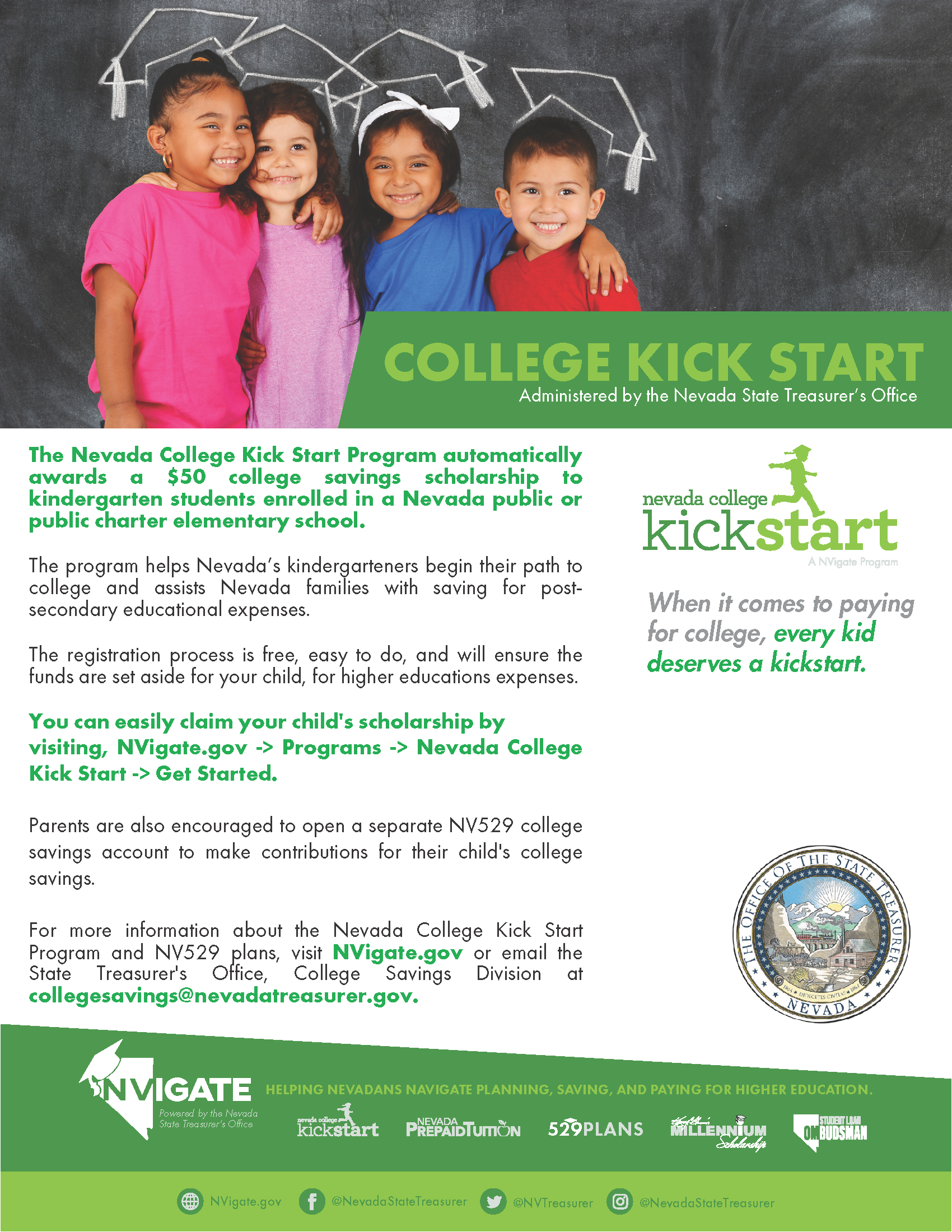 The Nevada College Kick Start Program awards every Nevada public school kindergartener with a free $50 scholarship. The program helps Nevada’s kindergarteners begin their path to college and assists Nevada families with saving for post-secondary educational expenses. The Kick Start scholarship is provided at no cost to eligible Nevada families.